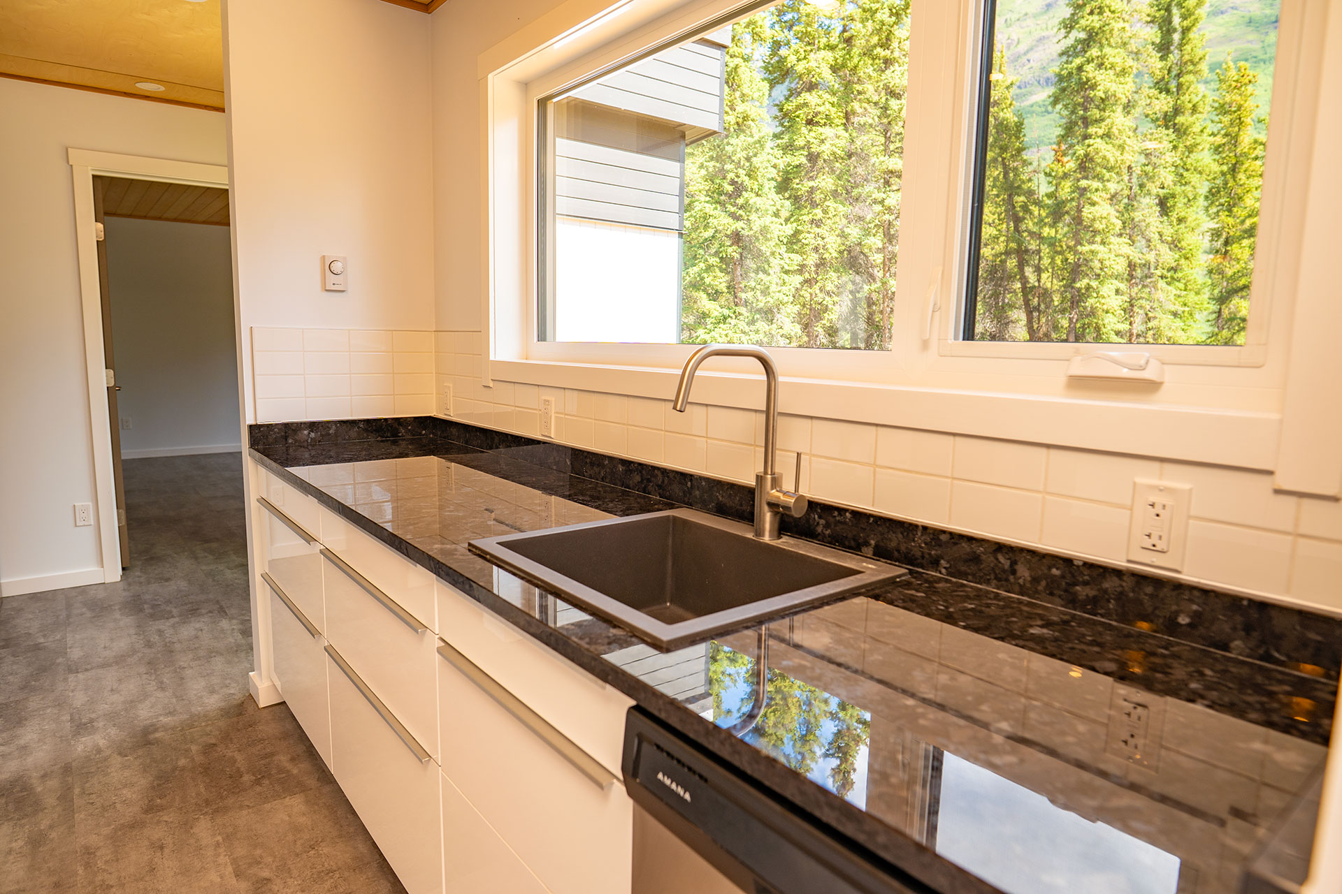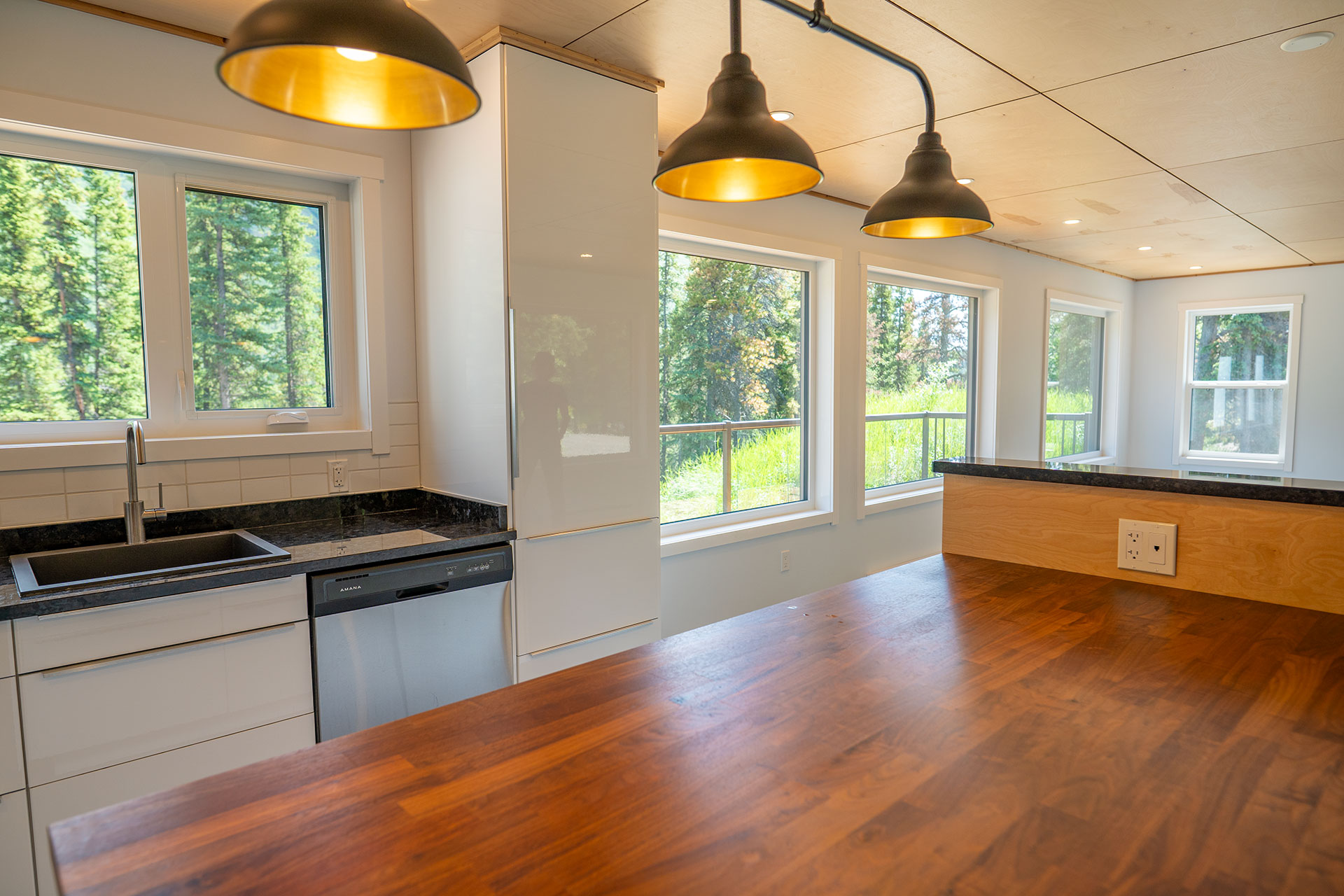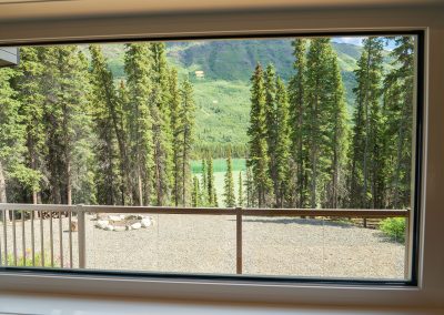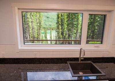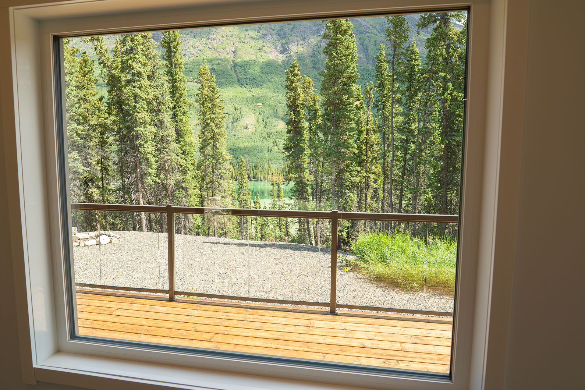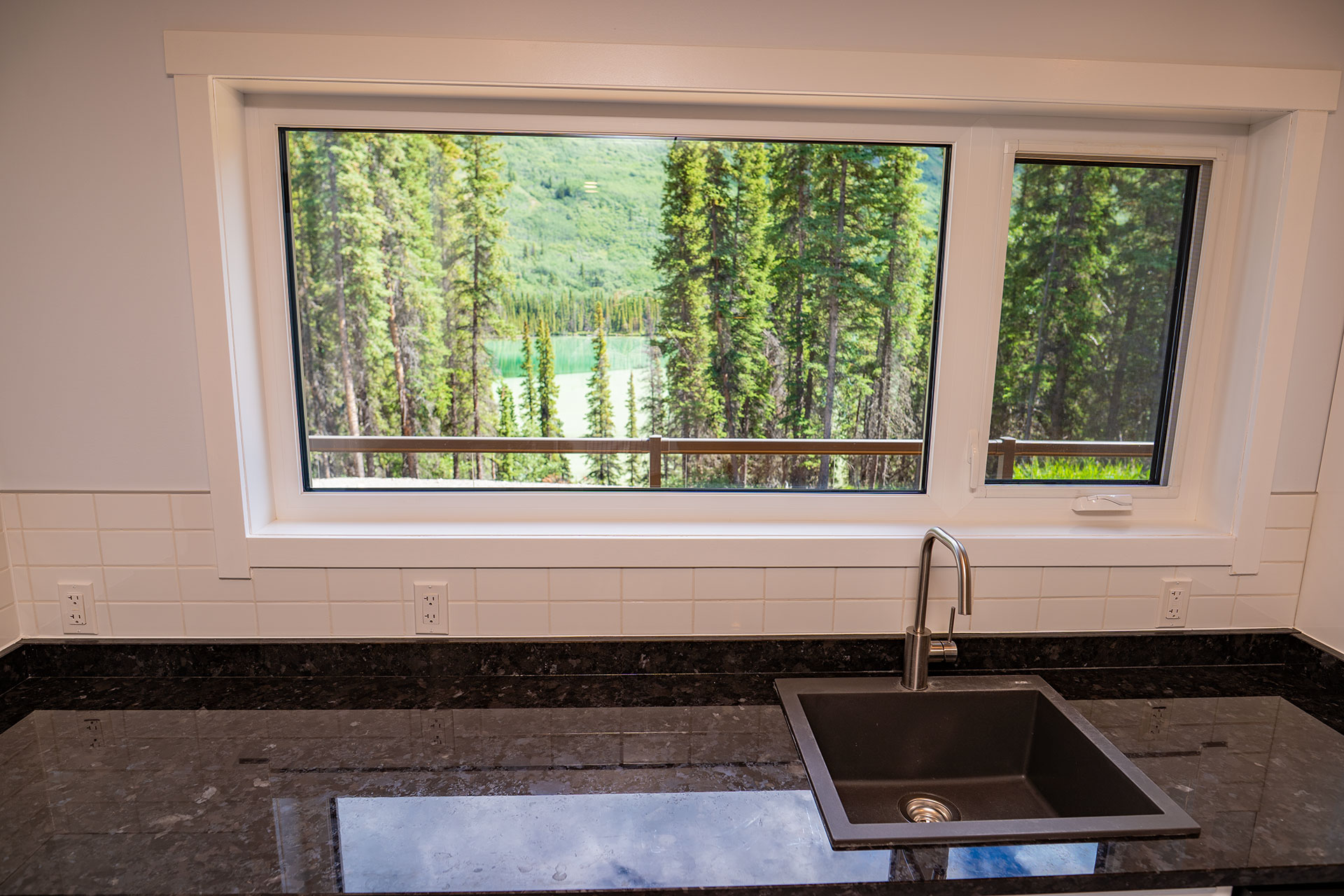 Energy-efficient triple-pane windows that keep the home warm in Yukon’s winters while framing panoramic lake views. R60 insulation in roof, styro-foam envelope around whole building, heated crawl space with lights, easily used for extra storage. Well, 50 gallons per minute.
