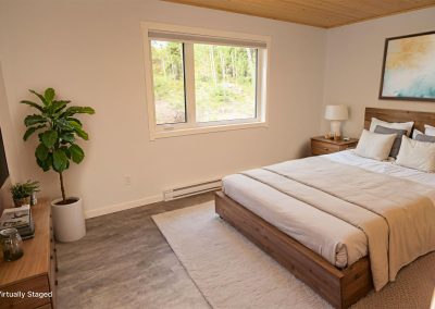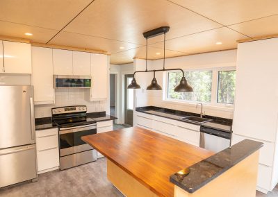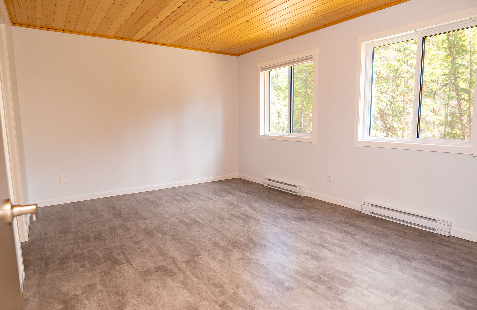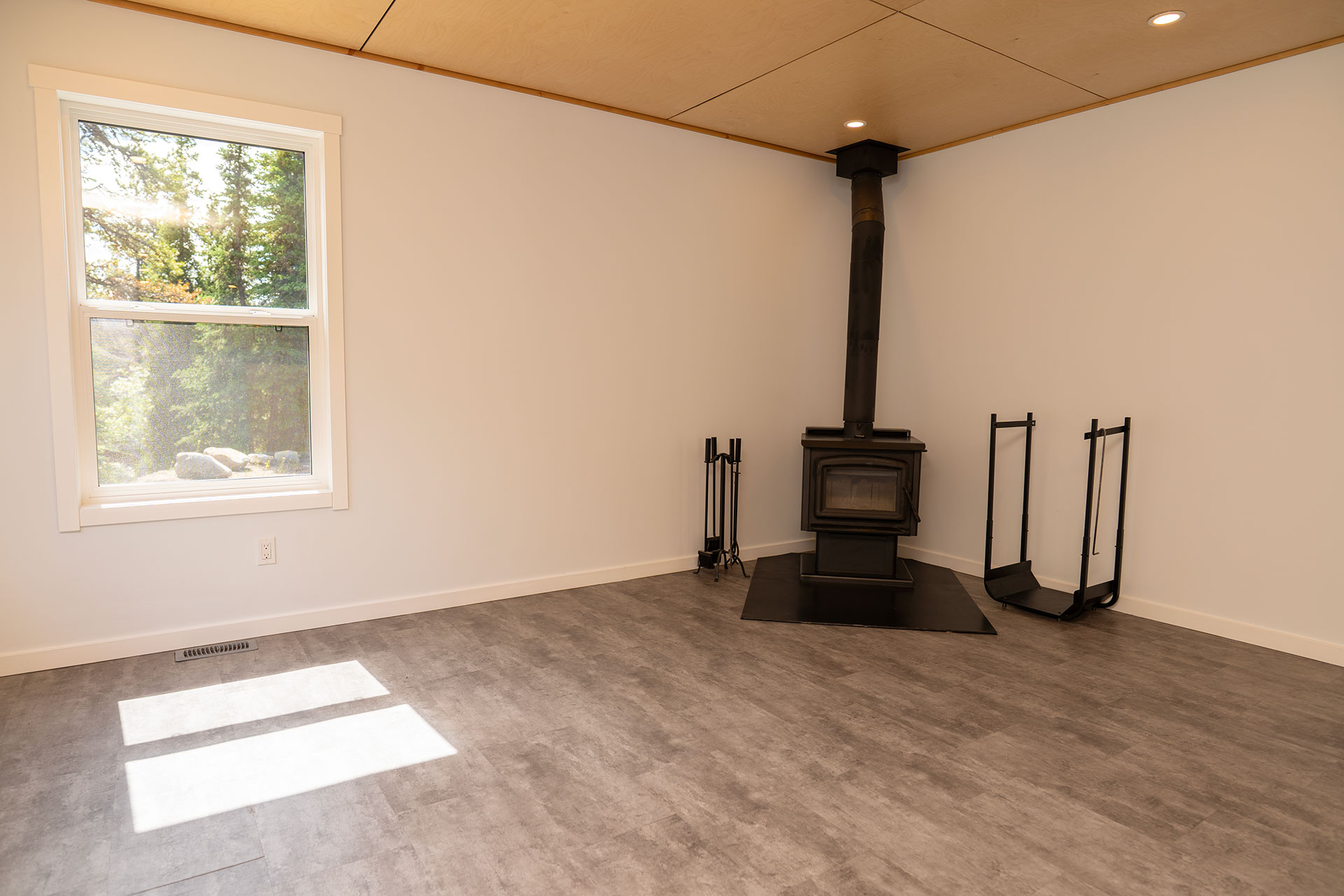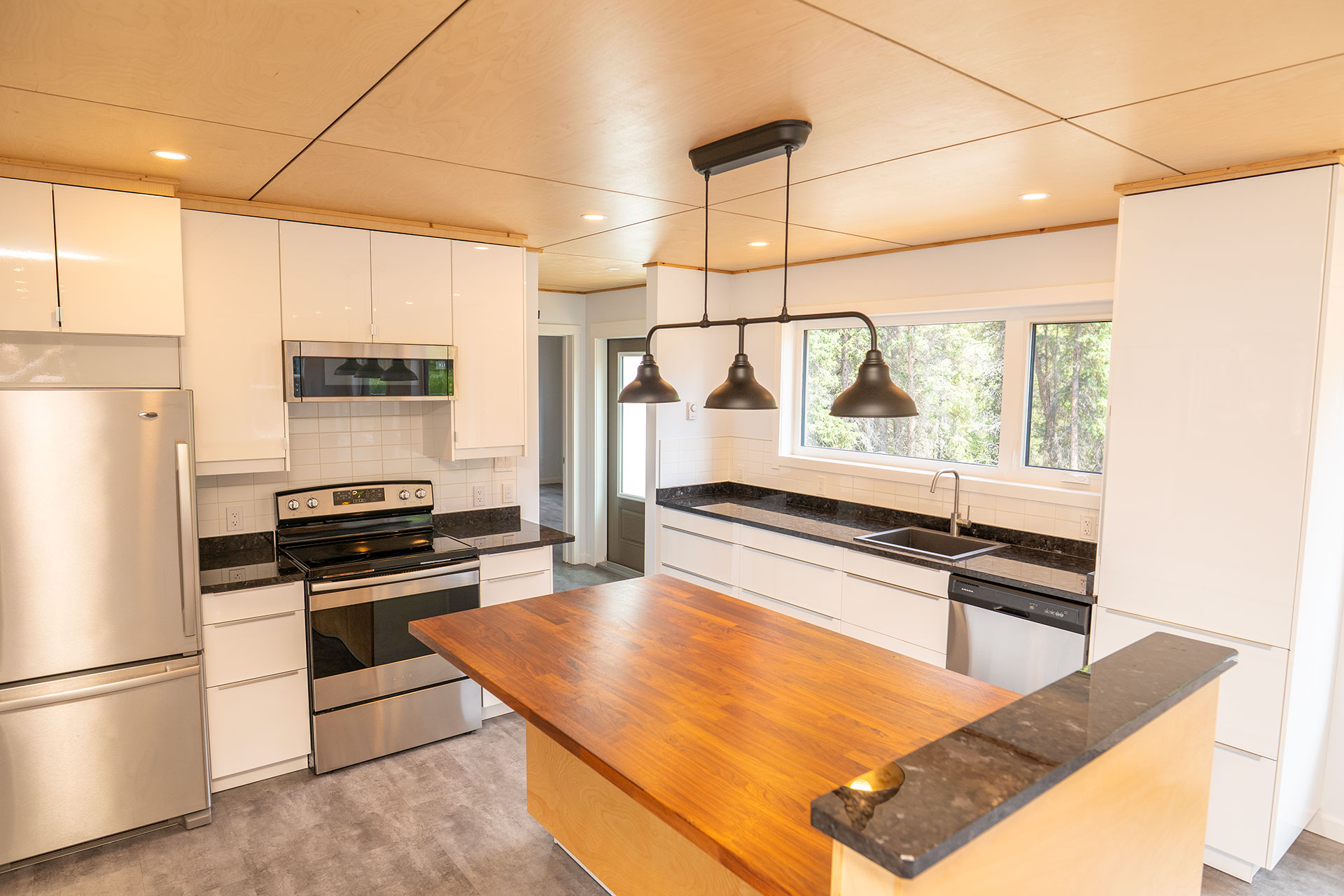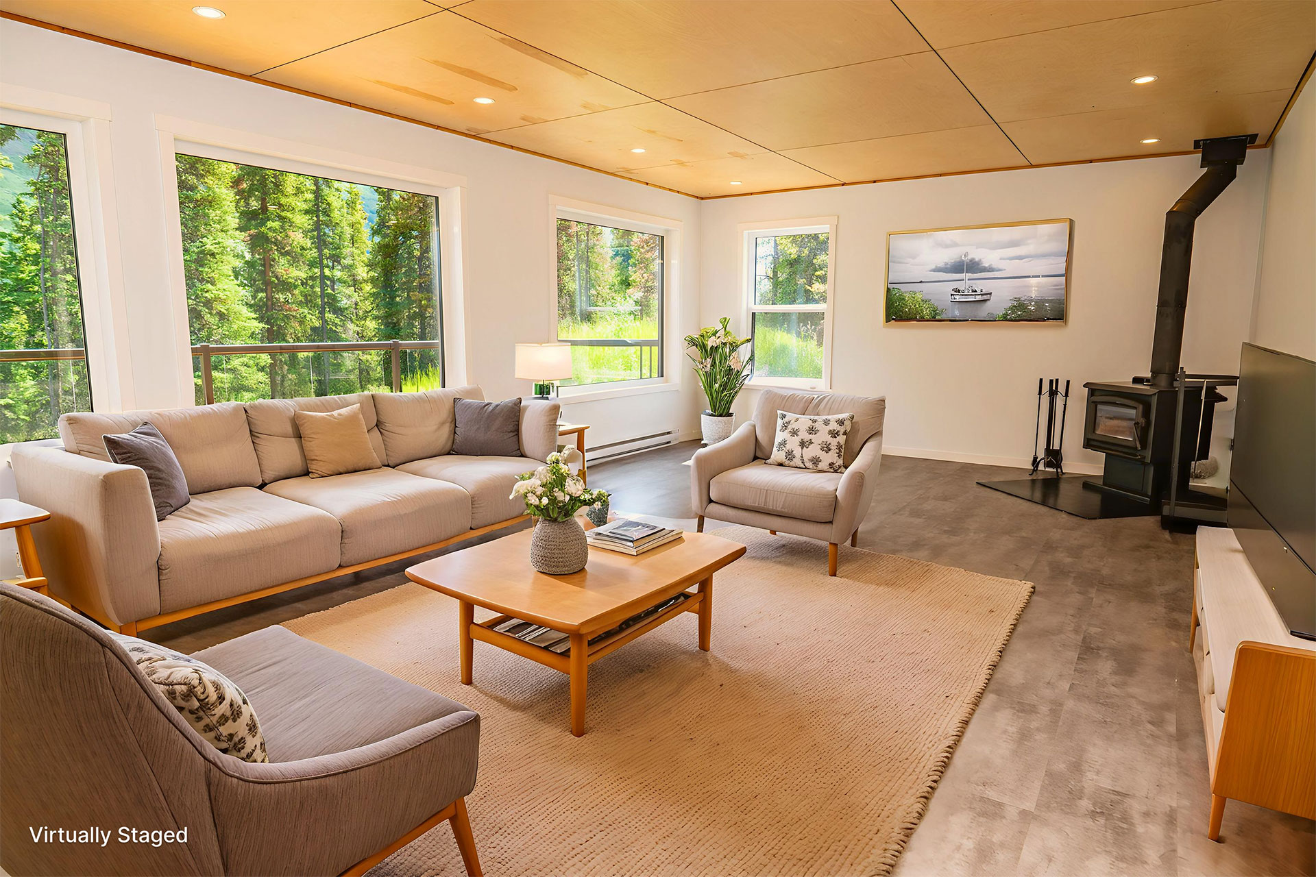 Energy-efficient triple-pane windows that keep the home warm in Yukon’s winters while framing panoramic lake views. R60 insulation in roof, styro-foam envelope around whole building, heated crawl space with lights, easily used for extra storage. Well, 50 gallons per minute.
